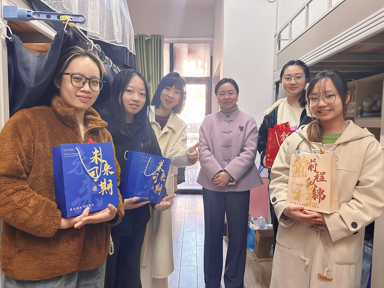 12月19日,学院党委书记郭梅、党委副书记张晨露深入考研学子宿舍走访慰问,为2026届备考学子送上暖心大礼包。走访中,领导们与学子亲切交谈,细致询问复习进度与生活困难,叮嘱大家劳逸结合、调整心态。满载关怀的礼包与暖心嘱托,让备考学子倍感鼓舞,纷纷表示将带着这份支持全力以赴,冲刺考研目标。