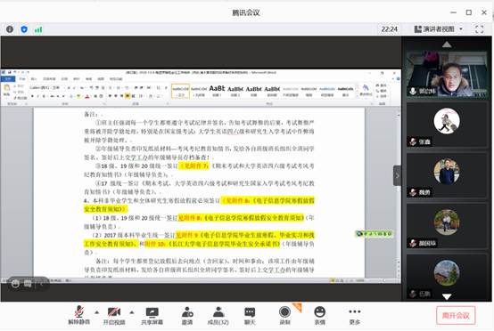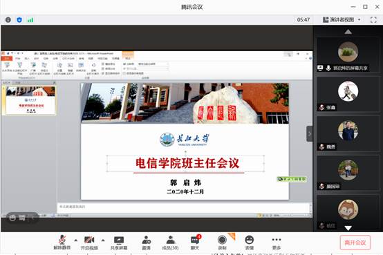 期末将至,为贯彻落实寒假期间学校对于学生安全教育及管理工作方面的要求,为把期末近期学生日常教育与管理工作做实、做好,确保我院同学能够提高自我防护意识,度过一个安全快乐的假期。2020124日,电子信息学院以腾讯会议的方式召开了班主任、辅导员工作大会,会议由郭启炜书记亲自主持,本次会议以安全教育为中心,并展开寒假前后学生安全教育与管理工作部署。