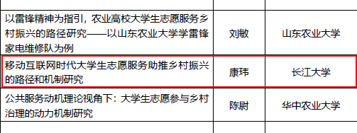 2021年6月,共青团中央青年发展部依托全国学校共青团研究中心组织开展2021年度共青团实践育人工作课题评审工作。经过资格审查、评审专家委员会评审并公示,从全国各知名大、中学校、教育科学研究院及省级团委申报的课题材料中遴选出了71项课题予以立项。我院团委书记康玮老师主持的《移动互联网时代大学生志愿服务助推乡村振兴的路径和机制研究》获得立项,成为湖北省获此课题立项的6个课题项目之一。《移动互联网时代大学生志愿服务助推乡村振兴的路径和机制研究》课题是基于电信学院长期开展的志愿服务和关心关爱留守儿童群体等社会实践活动,研究移动互联网时代大学生志愿服务助推乡村振兴有效路径与机制。