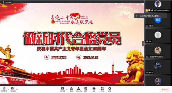 4月27日晚,人工智能11901支部校级班团会线上举行。本次团会以“喜迎党的二十大”为主题,号召青年团员要发挥“党有号召,团有行动”的光荣传统,坚定不移听党话,跟党走;会上还就“传承冬奥精神”进行了分享和交流,活动邀请在京青年代表进行冬奥故事分享,团结带领青年建功新时代、奋进新征程,继续发扬北京冬奥会、冬残奥会中彰显出的担当尽责精神,为时代建设贡献力量。最后人工智能11901班班主任伍鹏老师为本次班团会做了总结讲话,给同学们提出了宝贵意见。