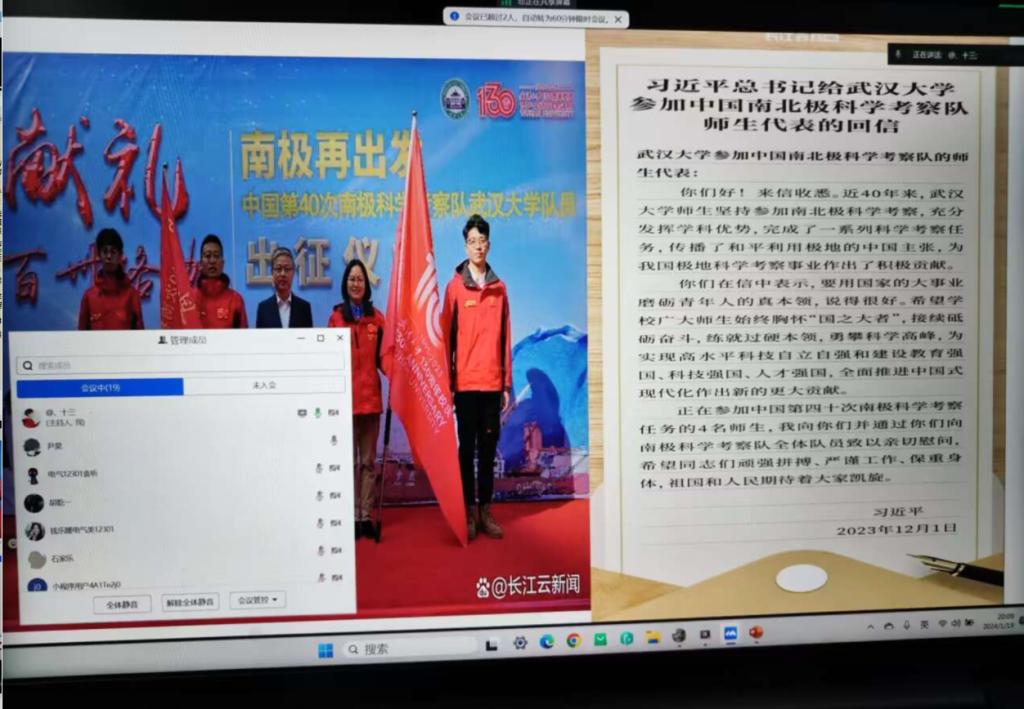 为深入学习习近平总书记给武汉大学参加中国南北极科学考察队的师生代表重要回信精神,引领青年学子牢记习近平总书记“胸怀‘国之大者’,接续砥砺奋斗,练就过硬本领,勇攀科学高峰”的殷殷嘱托,我院于1月19日至21日组织全体学生线上开展学习习近平总书记重要回信精神主题班会。