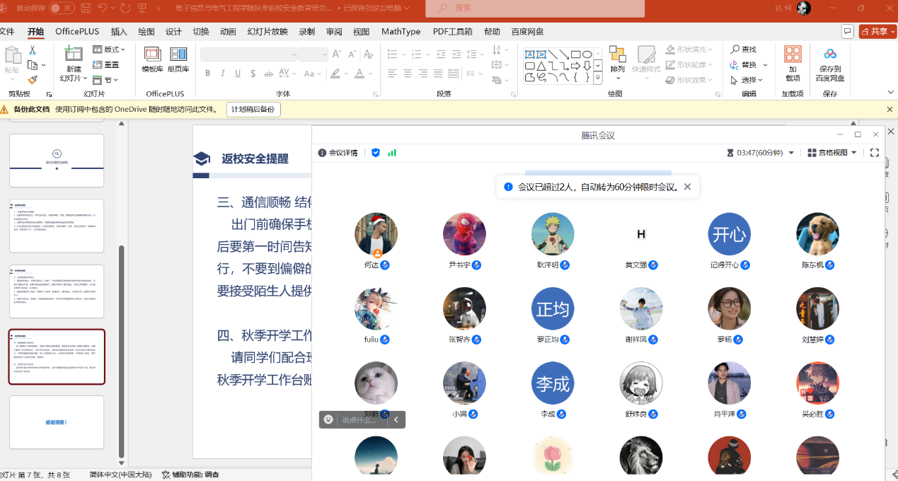 本次主题班会主要围绕新生开学线上报到流程及注意事项;学生来校前安全教育(消防、交通、人身、财产安全,防诈骗、溺水、校园欺凌、毒品等),加强网络文明建设教育;秋季开学学生报到返校要求、开学上课、补考注意事项等几个方面开展教育。