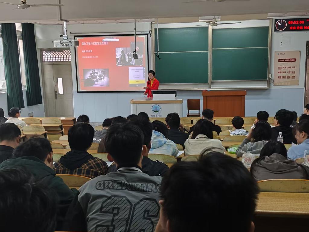 会上,围绕“人身安全、实验室安全、宿舍消防安全、网络信息安全、心理健康安全”等方面进行了系统宣讲。她结合校园实际情况和典型案例,提醒同学们牢固树立安全意识,做到防患于未然。在实验室安全方面,重点强调了操作规范、化学品管理、电气设备使用、实验废物处置等要求,提醒大家严格遵守实验室规章制度,确保实验过程安全可控。在人身与校园安全方面,她提示同学们注意出行安全、晚间活动安全,警惕电信诈骗、求职陷阱以及不良校园贷等风险,遇到可疑情况要及时与学院联系。在宿舍与消防安全方面,要求大家做到不使用违禁电器,不私拉电线,保持宿舍整洁,熟悉消防通道,提高自我保护和应急处置能力。此外,还强调了心理健康的重要性,希望同学们在学习、科研压力较大时主动调适心态,合理安排作息,如遇到心理困惑及时与学院沟通寻求帮助。