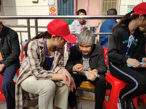 尽管天气寒冷,志愿者们仍然全部准时到达集合地点,在经过半个小时的路程后,同学们到达了荆州市金秋老年公寓,院长等人对于同学们的到来也表示了欢迎,爷爷奶奶看到了同学们,脸上也洋溢出幸福的笑容。根据同学们事先分配好的任务,每个人一来到老年公寓就主动开始了工作,有人扫地,有人切水果,有人搬凳子,还有人坐在老人旁边聊天、、、打扫完毕后,同学们愉快地和老人们做着游戏,不仅同学们和班主任老师阮宁君都献上了自己擅长的歌曲节目,就连老人们主动为同学们展现美妙的歌喉,现场十分热闹。看着老人们脸上温暖的笑容,同学们也感到无比的开心。