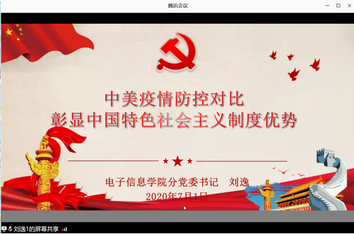 202071日上午9点,电子信息学院通过腾讯会议召开了迎党的生日、讲战疫故事、悟初心使命为主题的党课学习。会议由学院分党委副书记郭启炜主持,全体教工党员和学生党员参加了此次会议。