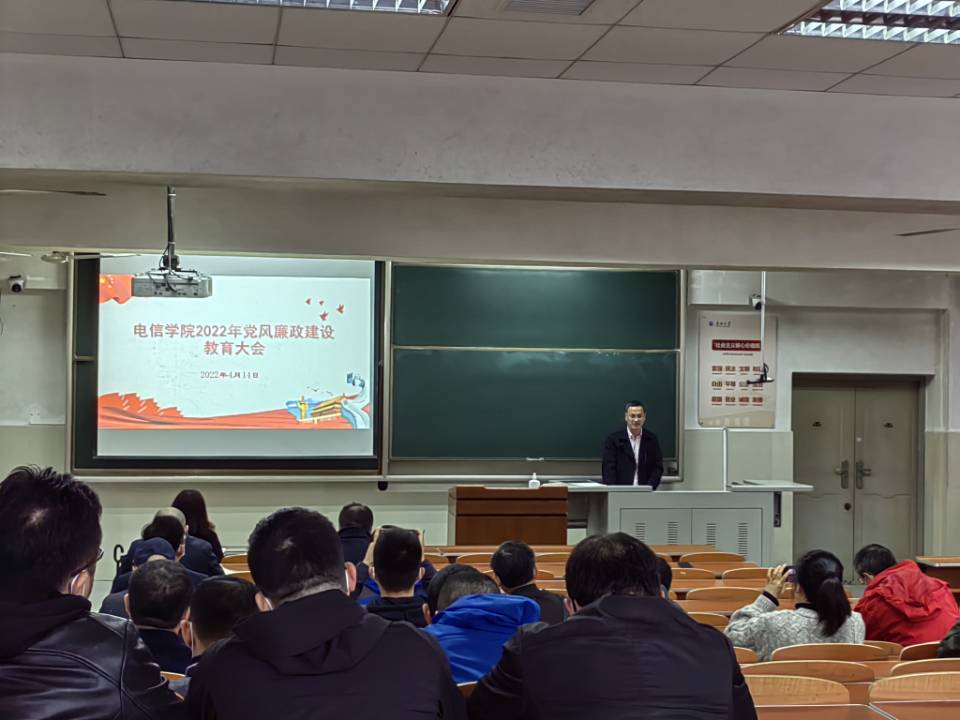 4月14日下午,在主教108教室,学院党委副书记郭启炜在本年度学院党风廉政建设教育大会上向全院教职工传达了学校纪委“加强同级监督、政治生态分析研判工作布置会”会议精神,会上带领全院教职工一起学习了《中共williamhill中文委员会关于推进清廉长大建设的实施方案》、《中共williamhill中文委员会关于推进风清气正政治生态建设的实施办法(试行)》、《校纪委 “5384”行动计划推动清廉长大建设》等文件精神,解读《筑牢“清廉电信学院”建设工作方案》,详细讲解了“筑牢清廉电信学院”的四个工程(“政治清明”建设工程,“院风清朗”示范工程,“教风清正”保障工程,“学风清新”培育工程)和12个方面的内容(压实全面从严治党主体责任、加强党员干部思想政治教育、弘扬“拼、抢、严、实”工作作风、加强清廉班子建设、加强清廉机关建设、加强清廉支部建设、加强清廉系部建设、落实立德树人根本任务、落实教师学习和培养机制、引导教师规范自身言行、推动“清廉文化”进班级和落实“三全育人”新途径)。
