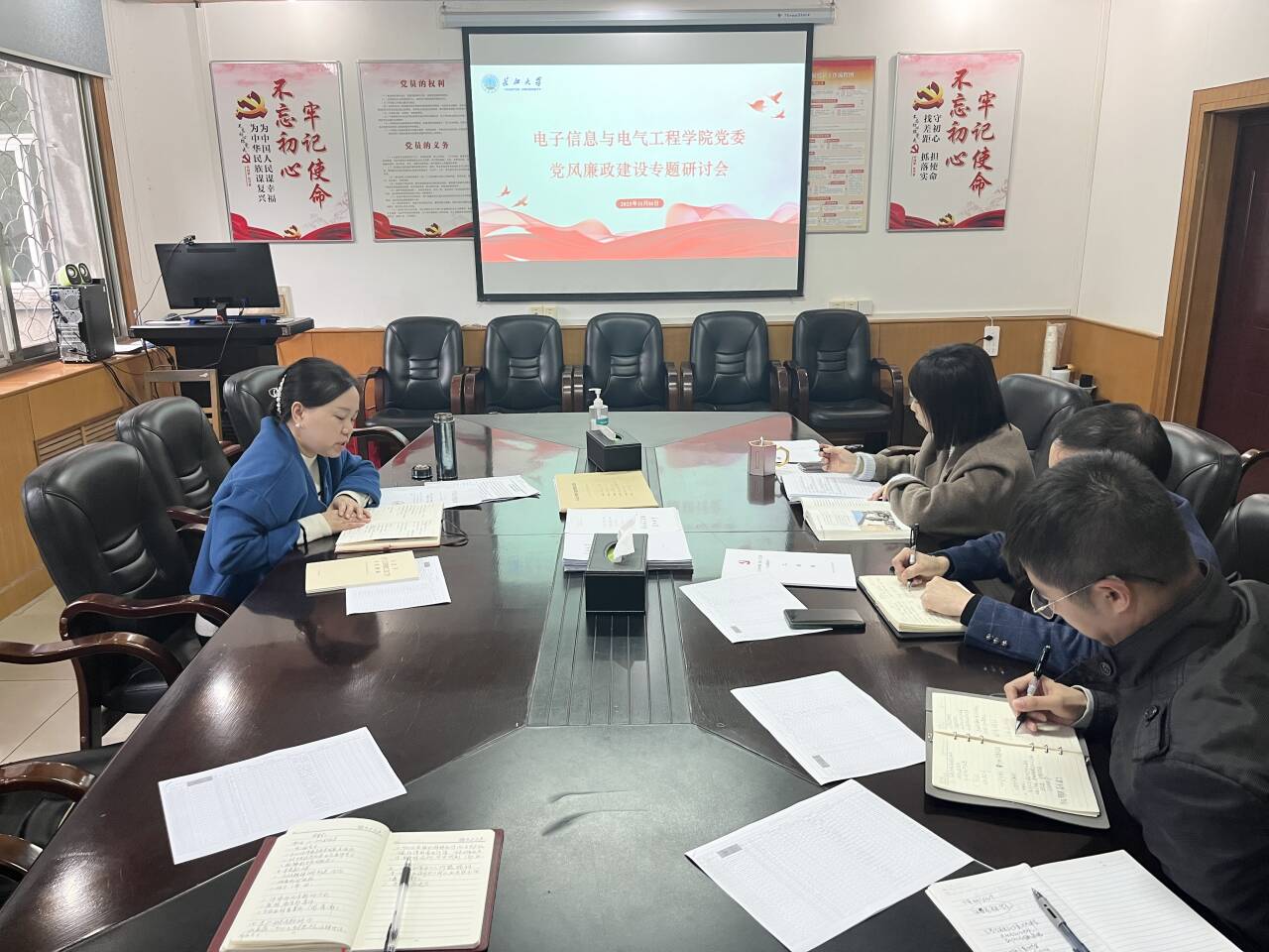 11月10日下午,学院党委组织开展2023年下半年党风廉政与师德师风建设专题研讨会。副院长魏勇、周箩鱼,党委副书记张晨露,院长助理蒋涛参加学习研讨,会议由党委书记郭梅主持。