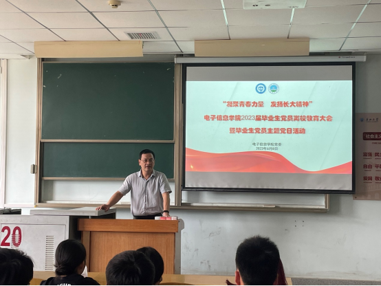 为深入推进学习贯彻习近平新时代中国特色社会主义思想主题教育,引导广大党员坚持以习近平新时代中国特色社会主义思想为指导,深入学习贯彻落实党的二十大精神,加强毕业生党员的理想信念教育、爱国爱校教育,激发毕业生党员的使命担当,6月8日下午,电子信息学院在13教C220组织毕业生党员开展以“凝聚青春力量 发扬长大精神”为主题的离校教育大会暨主题党日活动。学院党委副书记郭启炜、党建秘书李蒙、在校毕业生党员参加会议。