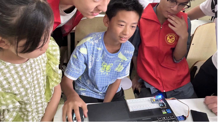 图为“愿益”团队成员进行相关科技竞赛作品展示—动手控制GPIO口的电平高低来控制LED的闪烁