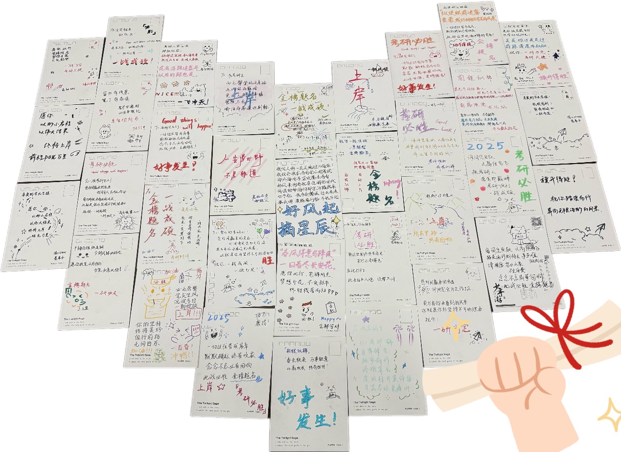 为给2026届考研学子加油鼓劲,学院低年级学生自发开展手写书信送祝福活动。大家执笔抒怀,将暖心鼓励、真诚祝愿落于笔尖,一封封书信承载着同窗情谊,为冲刺阶段的学长学姐注入温暖力量,让大家感受纸笺上的育人温度,让备考之路不再孤单。
