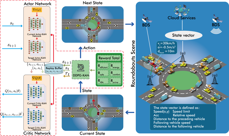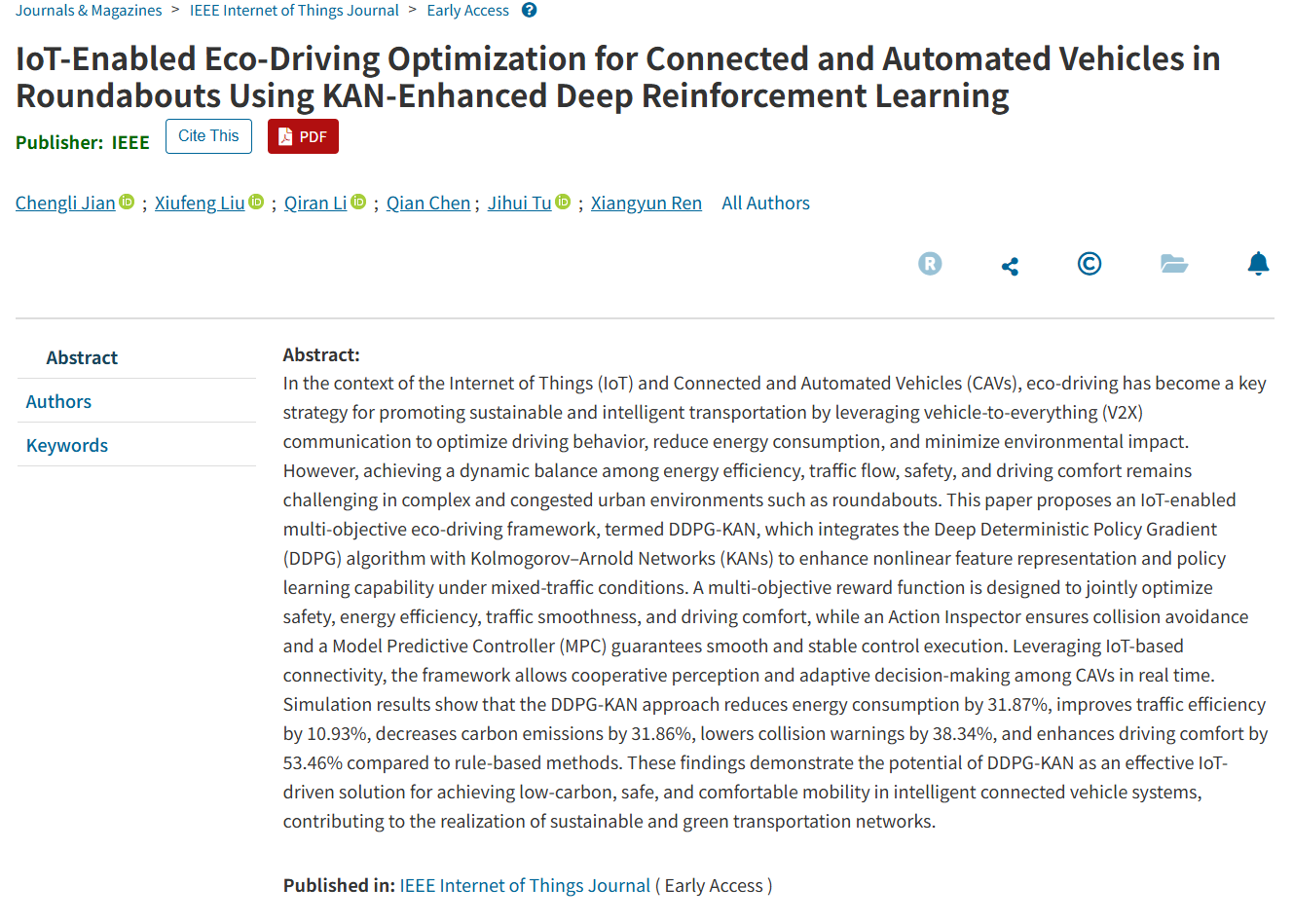 近日,电子信息与电气工程学院数智融合理论及应用研究团队在智能网联汽车生态驾驶优化领域取得重要进展,相关研究成果在国际物联网领域顶级期刊《IEEE Internet of Things Journal》(IEEE IoT)录用并正式发表。论文题为《IoT-Enabled Eco-Driving Optimization for Connected and Automated Vehicles in Roundabouts Using KAN-Enhanced Deep Reinforcement Learning》,论文第一作者为电信学院2023级研究生简成利,通讯作者为涂继辉老师,WilliamHill威廉希尔为第一完成单位。