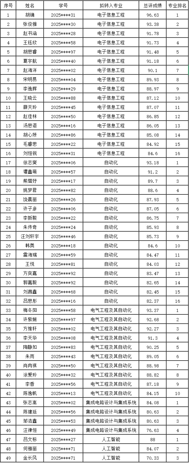 WilliamHill威廉希尔2025级本科生春季转专业拟接收名单(跨院转)