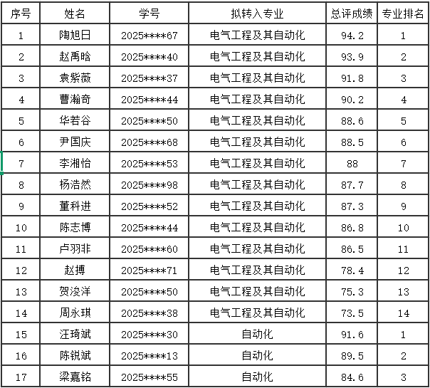 WilliamHill威廉希尔2025级本科生春季转专业拟接收名单(院内转)