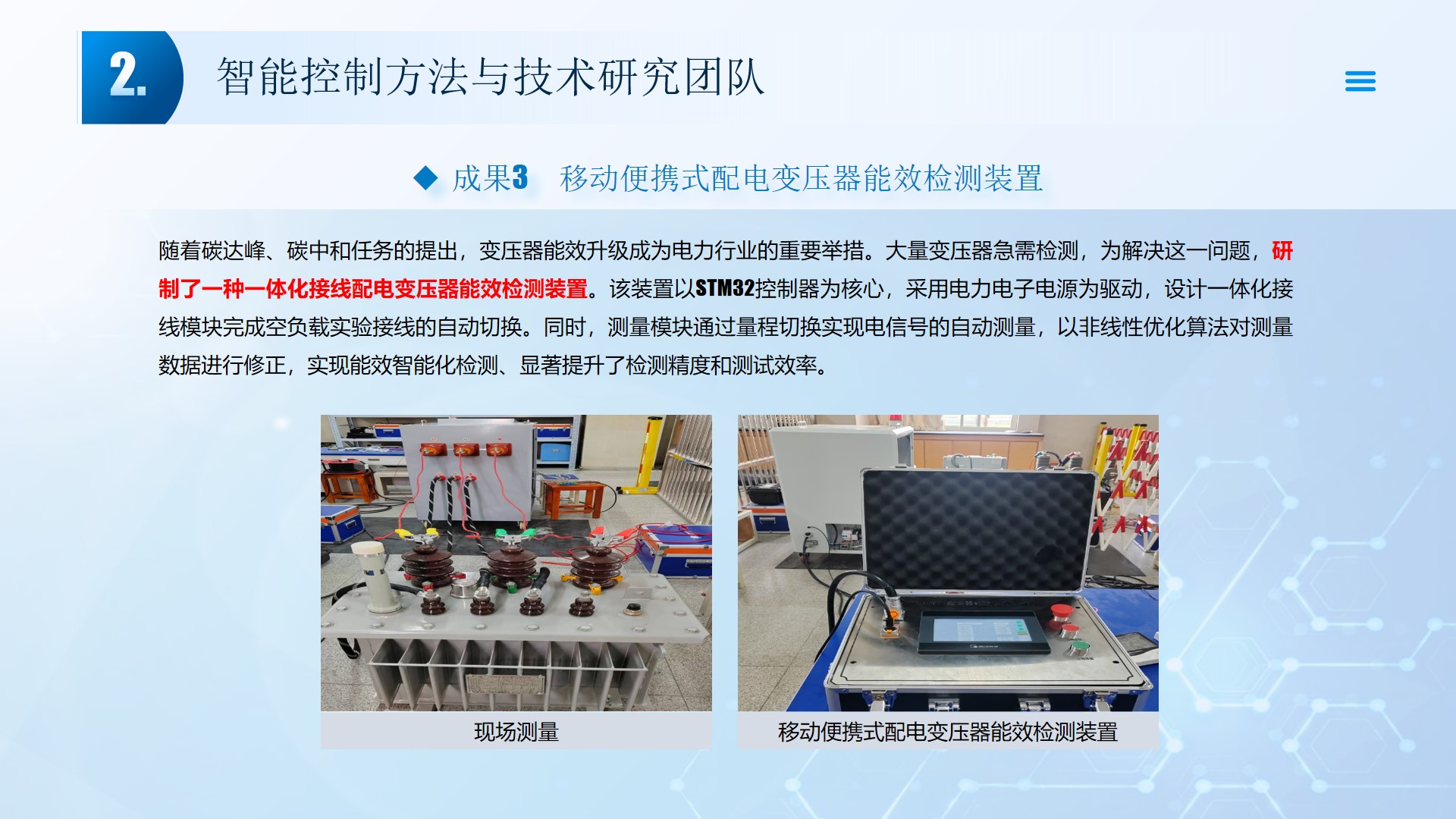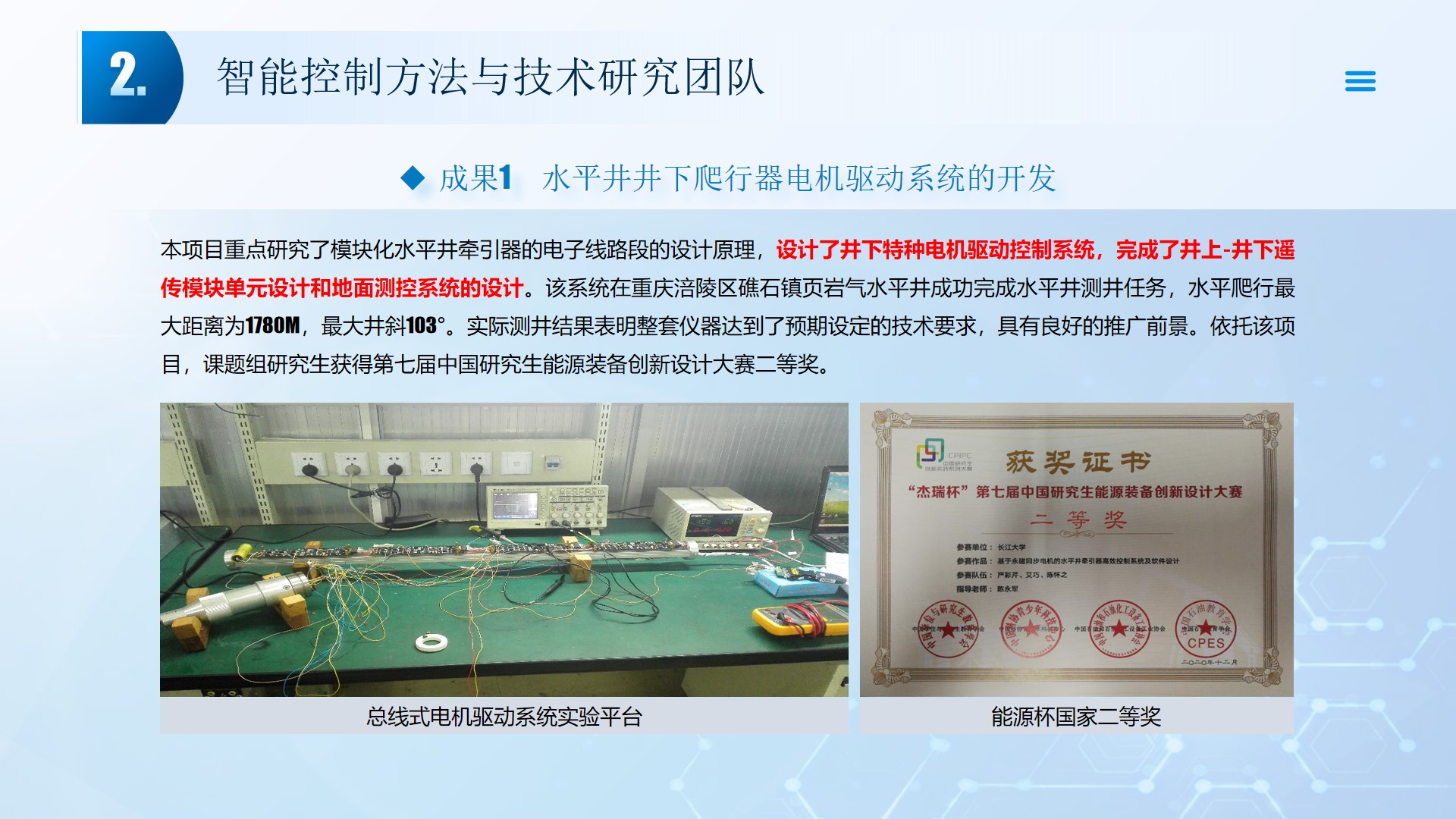 团队围绕智能控制方法与技术开展了多项科学研究工作,团队成员主持国家自然科学基金1项、湖北省自然科学基金1项、中石油创新基金及横向课题20余项。在《自动化学报》、《 高电压技术》等电气工程及其自动化权威学术期刊发表论文100多篇,出版专著2部,授权专利20余项;获湖北省科技进步三等奖2项。团队承担了全频段、移动便携式配电变压器能效检测系统研究,电力物资质量检测技术服务电力电缆绝缘状态和剩余寿命评估方法研究等多项科研项目,部分成果已在国家电网、油田现场取得了良好的应用效果。